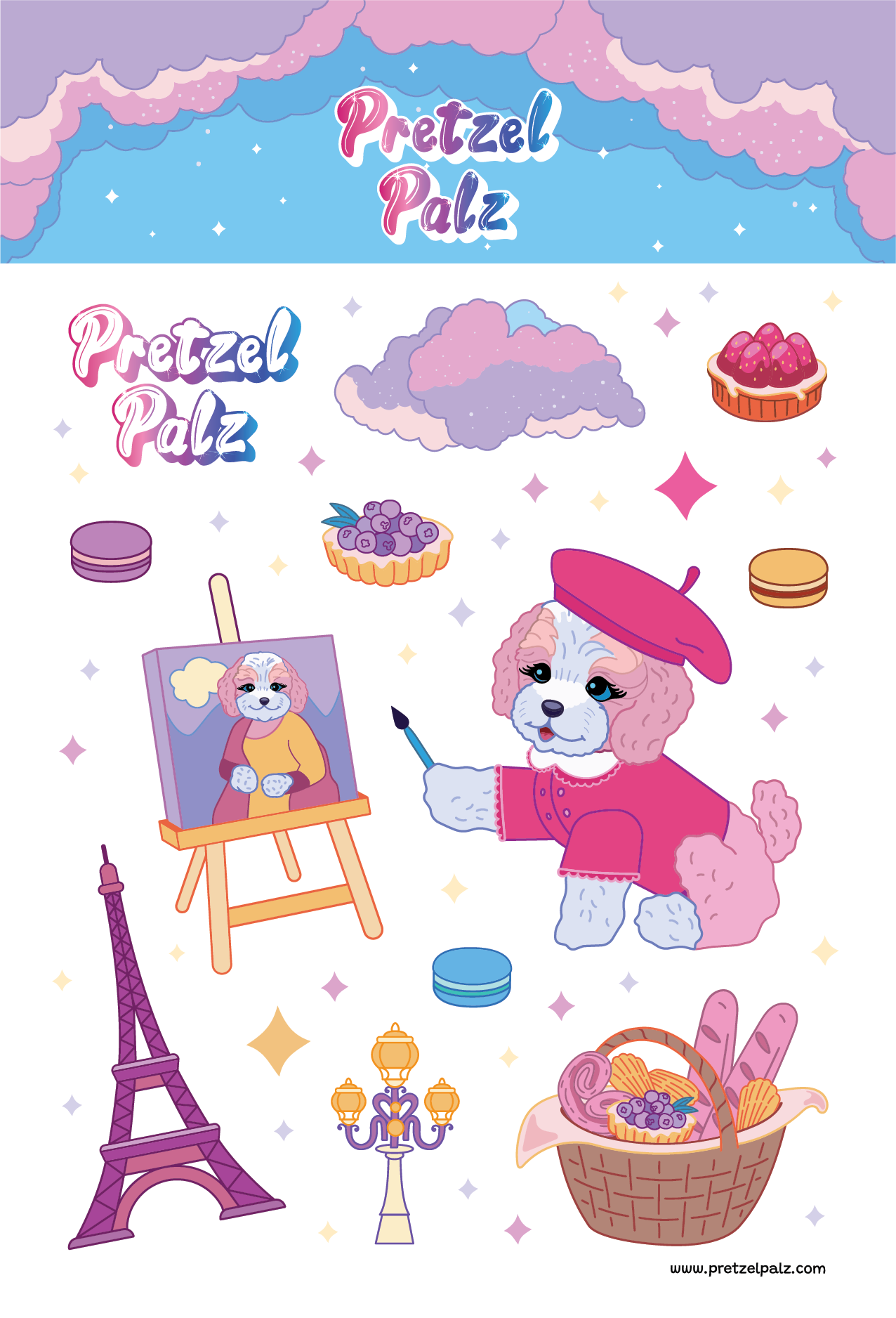 Decorate your world with Pretzel's Paris adventures! This sticker pack includes Pretzel, a the Eiffel Tower, macarons and more magical moments from France.